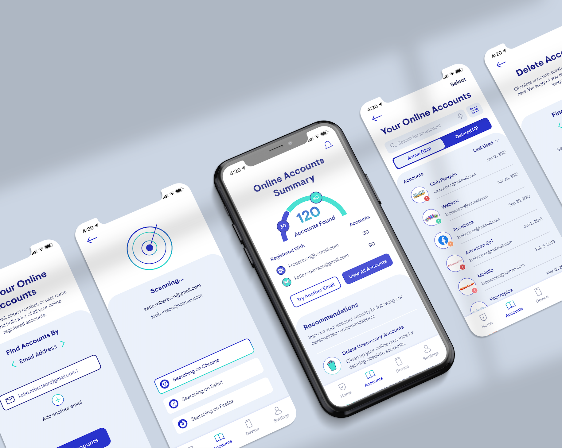 When interviewing users, a key pain point raised was that they had no idea about the true scale of their online profile and had no easy way to find out. With Protekt, users can easily and quickly find all of their online accounts connected to a specific email, username, or phone number to build a comprehensive understanding of their online profile.